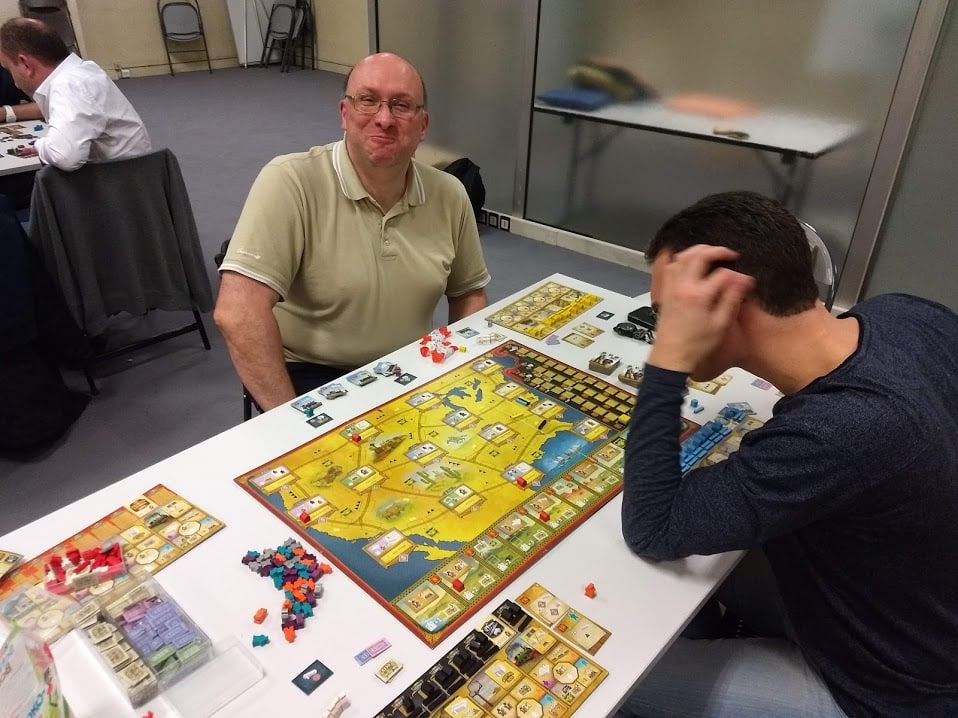Table 3, Steph, Fred, Nicolas, Dylan et Marie-Odile ont joué à Archipelago. C’est un jeu unique en son genre car il est coopératif et compétitif à la fois et tout est négociable entre les joueurs ! Dans Archipelago, les joueurs s’entraident pour coloniser le nouveau monde afin d’éviter une révolte de la population indigène tout en gérant au mieux leurs ressources respectives pour gagner le plus de points de victoire.
