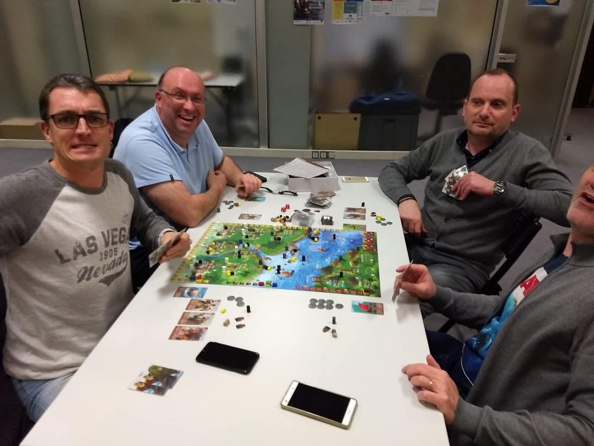 Suivi d’un Carcassonne.Score final : Bertrand 51 points, Fred 48 points, Véronique 47 points, Nicolas 38 points et Sylvie 34 points.
