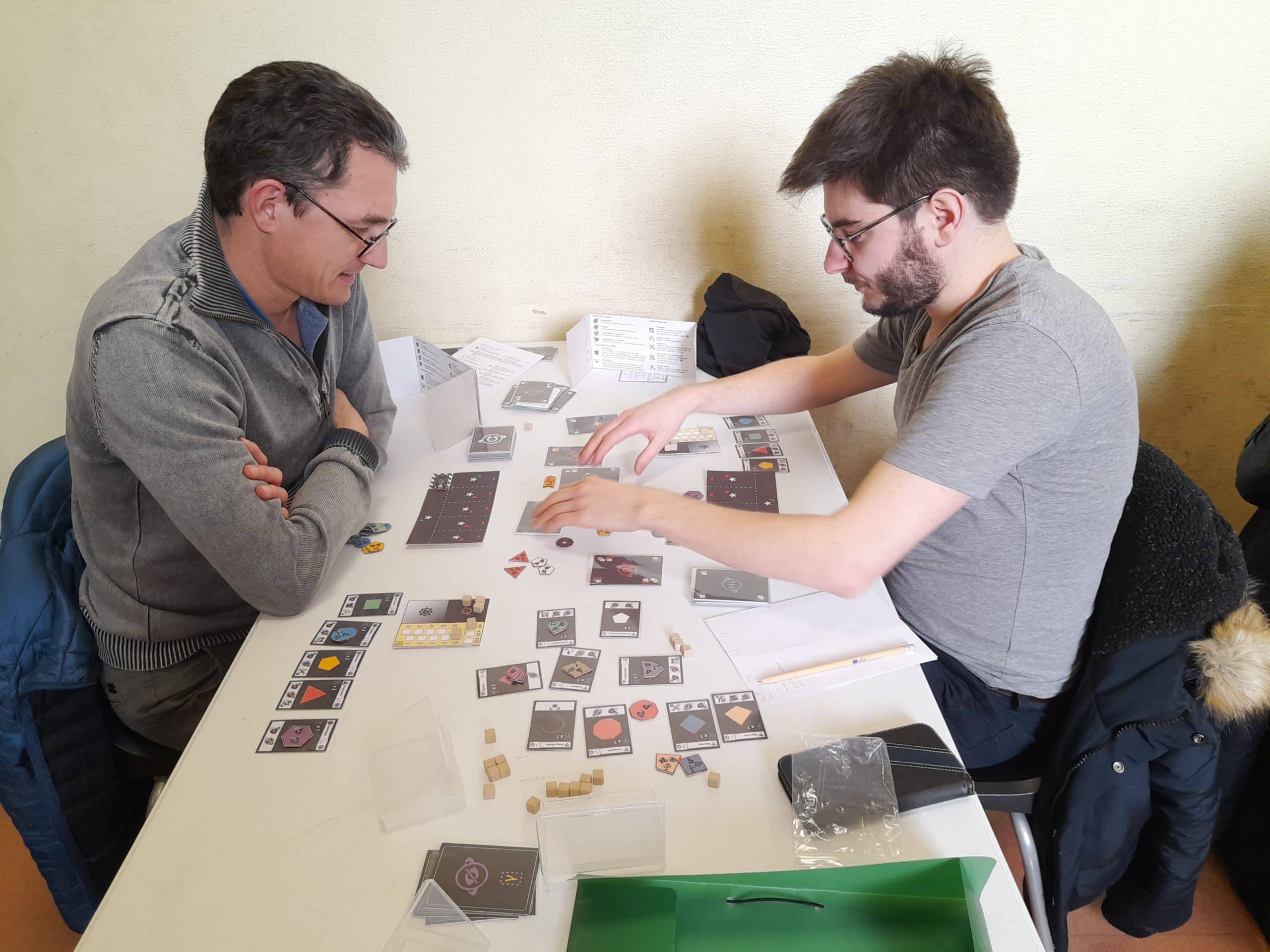 Ici, un Ludophile et auteur en herbe, Romain B., a présenté le prototype de son jeu à deux Star Veil, sur une thématique d’affrontement spatial, à Guillaume, puis à Benoît L. et Aymen.