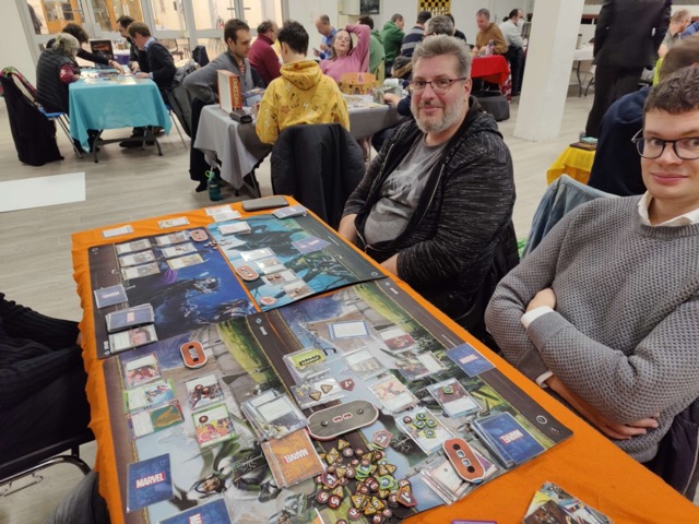 PandémiePandémie : Défi réussi sur l’ultime action ! Suivi par Unlock Game Adventure : Pandémie. Défi également réussi en 82:17 (12 indices, 2 pénalités, tous les bonus de temps réussis) très belle performance pour une découverte par 2 membres, sur un scénario difficile.Dune ImperiumDune ImperiumTerraforming Mars avec plateau et variante fait Terra Cimmeria (non officielle, fait par un fan).Cédric / Recyclon 85 pts, Thibaut / Valley Trust 65 pts, Julien et Romain 55 points. « Super partie ! c’est plaisant de voir le jeu se renouveler grâce aux fans, car on avait presque un effet overdose de TM avec des stratégies bien connues et quasi obligatoires sur les trois cartes standards, plus ou moins adaptés selon les extensions jouées. Là on découvre un nouveau jeu sans avoir à apprendre beaucoup de nouvelles règles. Top ! Je pense proposer à nouveau une table de TM avec une nouvelle extension de fan la semaine prochaine ».D&D5 MadarasWürm (adapté) Au temps des NéandertalRailroad Revolution avec extension ÉvolutionRailroad Revolution avec extension ÉvolutionAeon’s EndAeon’s EndInitiation à Marvel Champions The Card GameVif d’argent Alain S, Captain Marvel aka Adrien G, Iron man aka Alicien et Spider man (on ne révélera pas son identité) ont vaillamment triomphé de Rhino. Bravo à tous pour votre courage et gloire aux Avengers !Deal with the devilDeal with the devil. Partie arrêtée tour 3 (sur 5) après le premier passage de l’Inquisition. Le diable Vince C. ainsi que le cultiste David M. ont été dénoncés par les mortels Fanny et Charles C. Très bonnes sensations même si la partie déduction des rôles cachés passe au second plan après trois tours. Ça doit s’arranger avec le temps et plus de partie.BarrageLa carte Nil de Barrage. Vincent 179 points, Guillaume 137 points, Yoshi 92 points et Noémie 39 points.