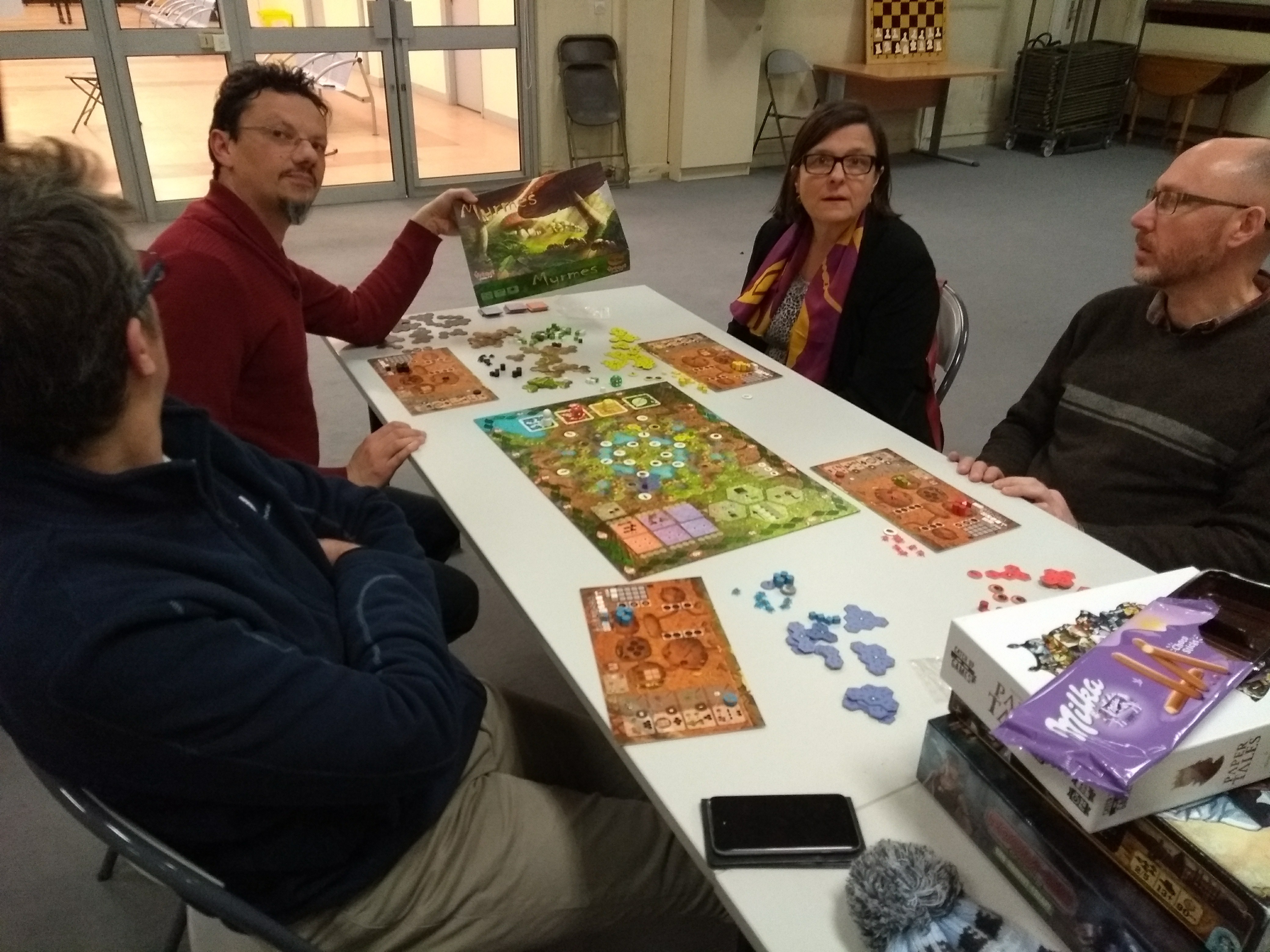 Stéphane a fait découvrir Myrmes à Marie-Odile, Vincent C. et Vincent R. Dans ce jeu, chaque joueur gère une colonie de fourmis et lutte pour établir sa suprématie ! Très bon jeu de chez Ystari, sorti en 2012 et primé par l’As d’or à Cannes en 2013.