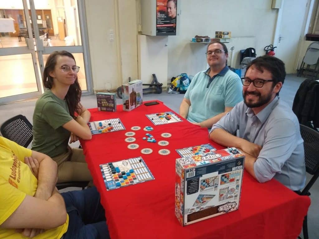 Table rouge : Romain, Adèle, Pierre-Olivier et Guillaume ont joué à Azul, un jeu abstrait avec un système d’achat, de placement et de résolution de tuiles. La mécanique est très simple, mais le jeu offre une certaine profondeur stratégique.