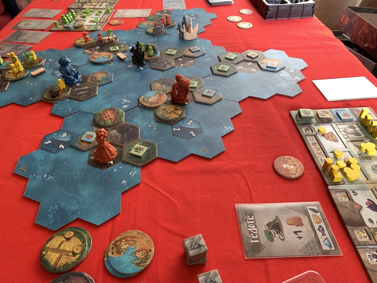 Après une longue lutte acharnée contre les éléments naturels, la colère des dieux et l’arrivée des conquistadors, ils ont réussi à conserver le contrôle de l’archipel. Ils ont donc pu décompter les points et départager le vainqueur : Vincent Ca. en tête avec 11 points (contributions 9 / utilisation des ressources -4 / idole 1 / nobles 2 / objectifs visibles 4 / Objectifs secrets -1) suivi de Hassan (5/-1/0/2/0/2) et Gautier (5/0/0/2/2/-1) ex-æquo à 8 points.